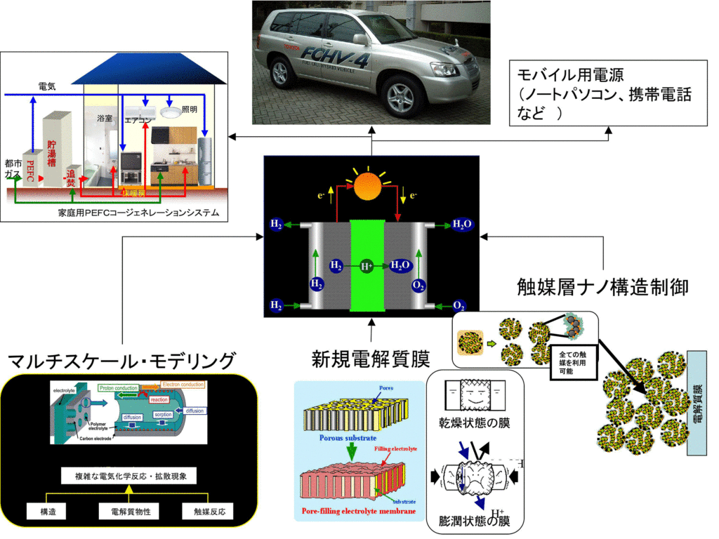 We are also focused on developing packed acid type electrolyte membranes, Pt-free carbon alloy catalysts and durable anion-exchange membranes based on the systematic design approaches. The technology of hydrogen production is also important for the hydrogen society, and water splitting materials are also being developed.